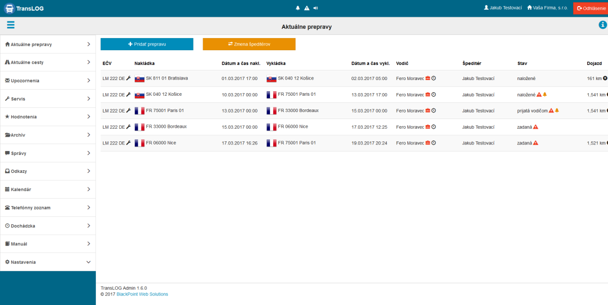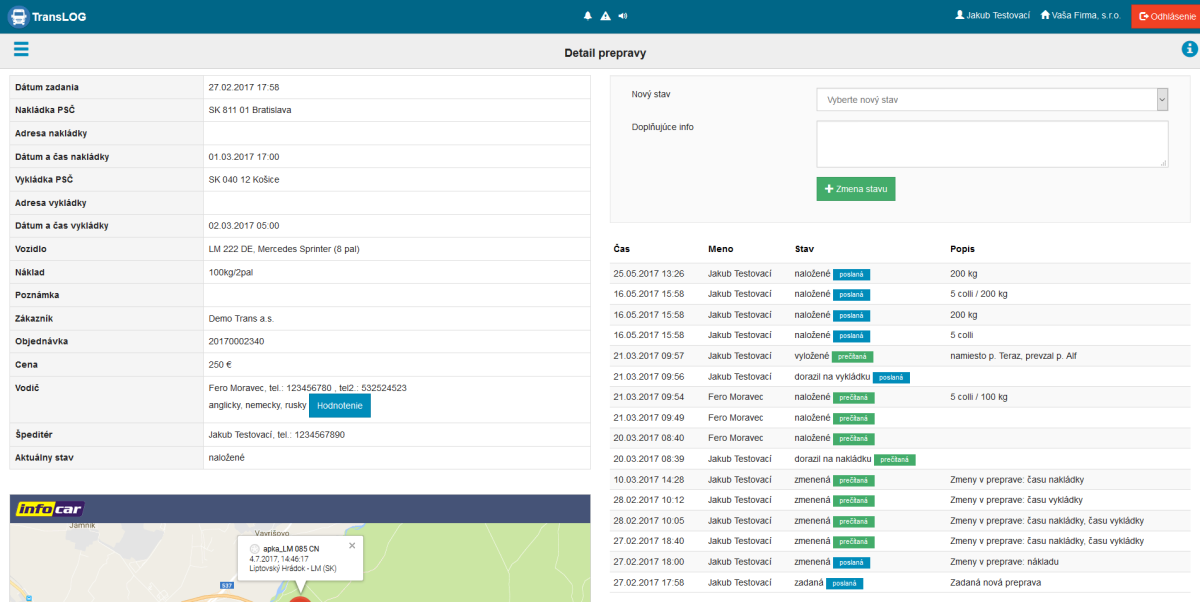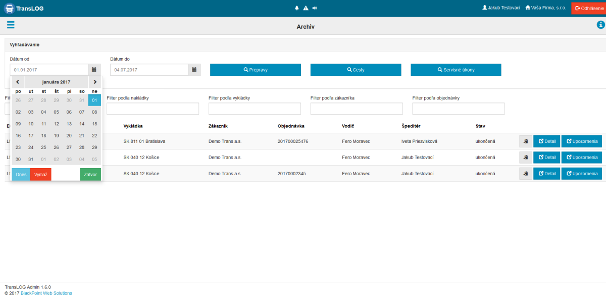 - archivovanie všetkých uskutočnených prepráv s vyhľadávaním a zobrazením detailov prepravy, archivovanie ciest vodičov aj servisných úkonov
