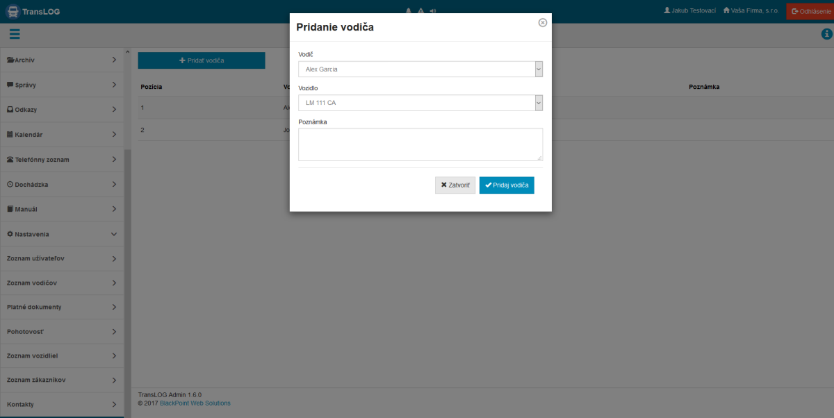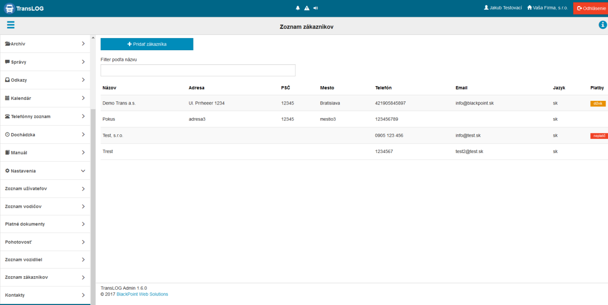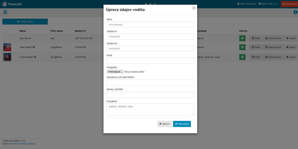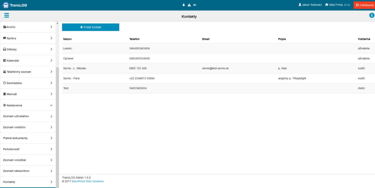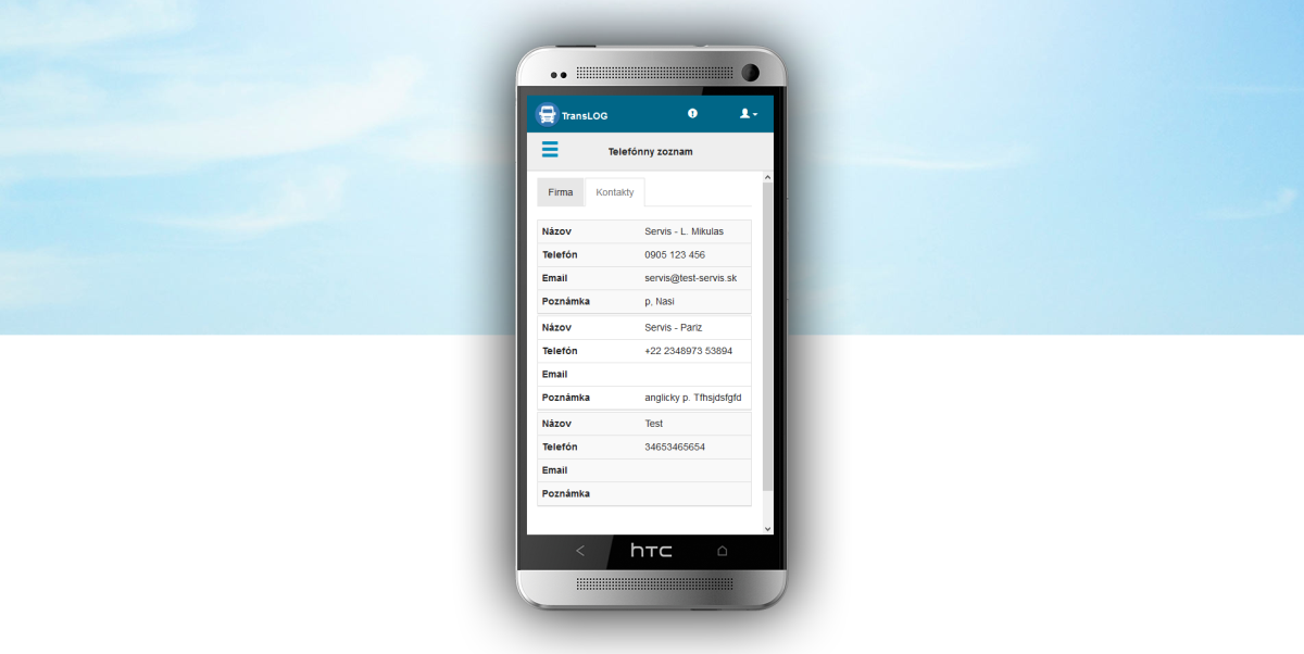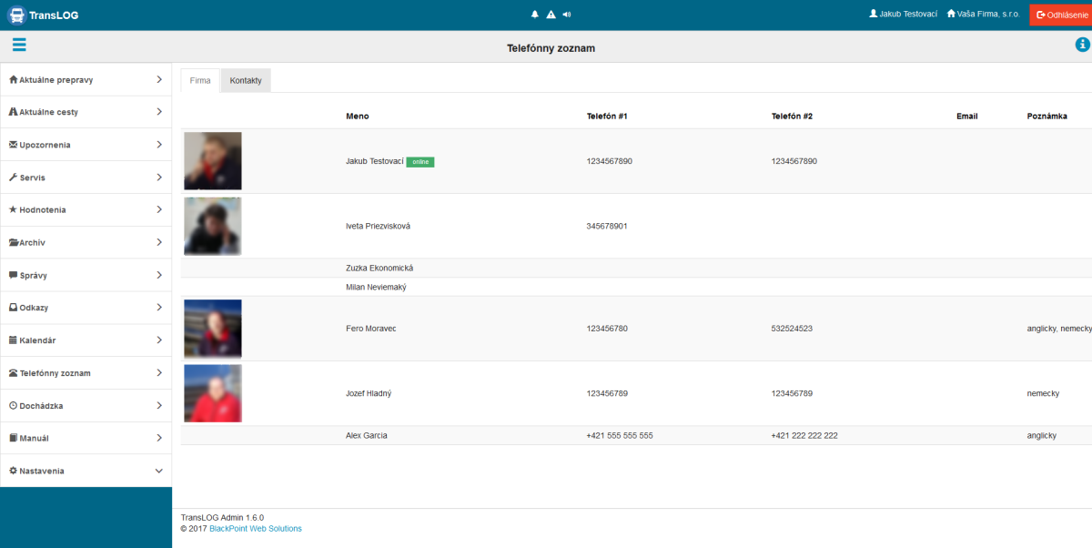 - firemný telefónny zoznam s možnosťou oddelených kontaktov pre špeditérov a vodičov