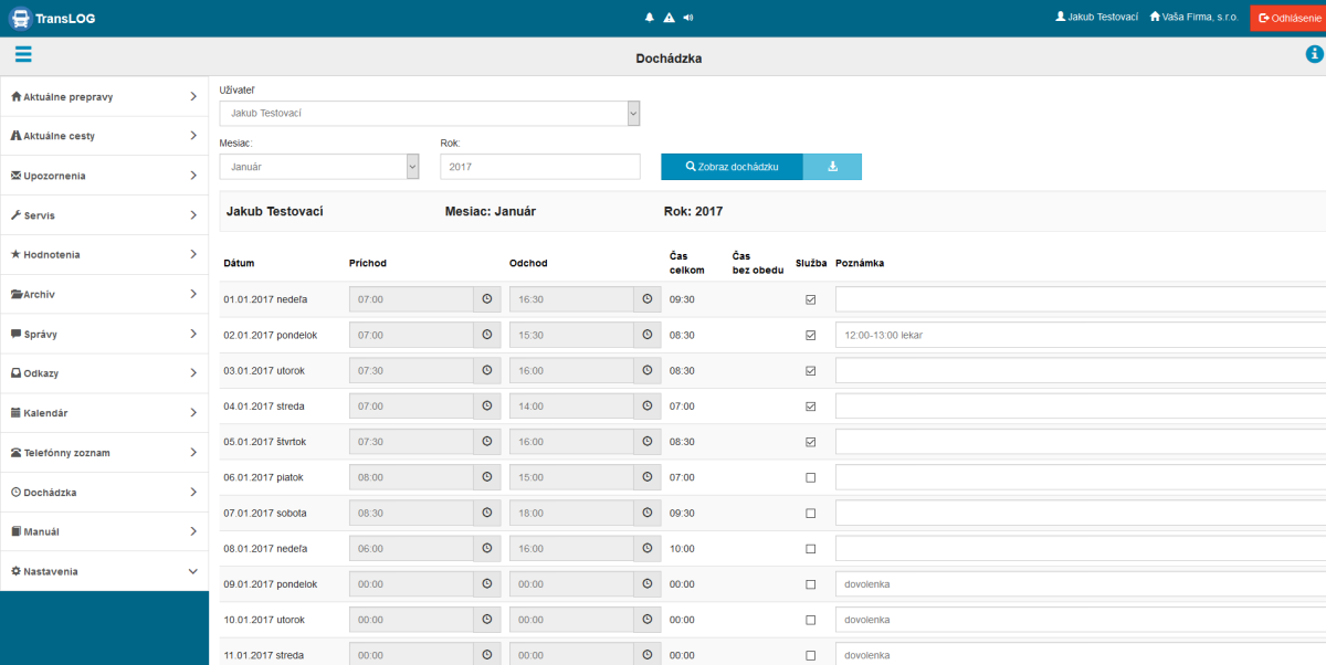 - sledovanie dochádzky špeditérov, evidovanie príchodu/odchodu pri prihlásení/odhlásení z aplikácie s možnosťou exportu mesačnej dochádzky ako PDF súbor