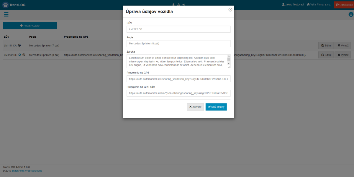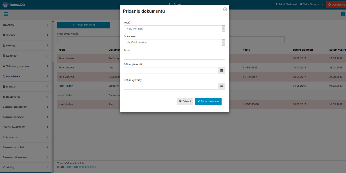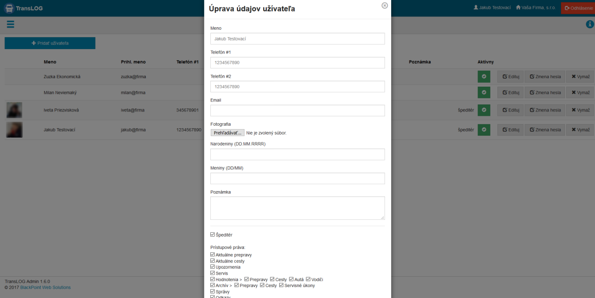 - zoznamy špeditérov, vodičov, platných dokumentov vodičov, vozidiel, zákazníkov, telefonické kontakty