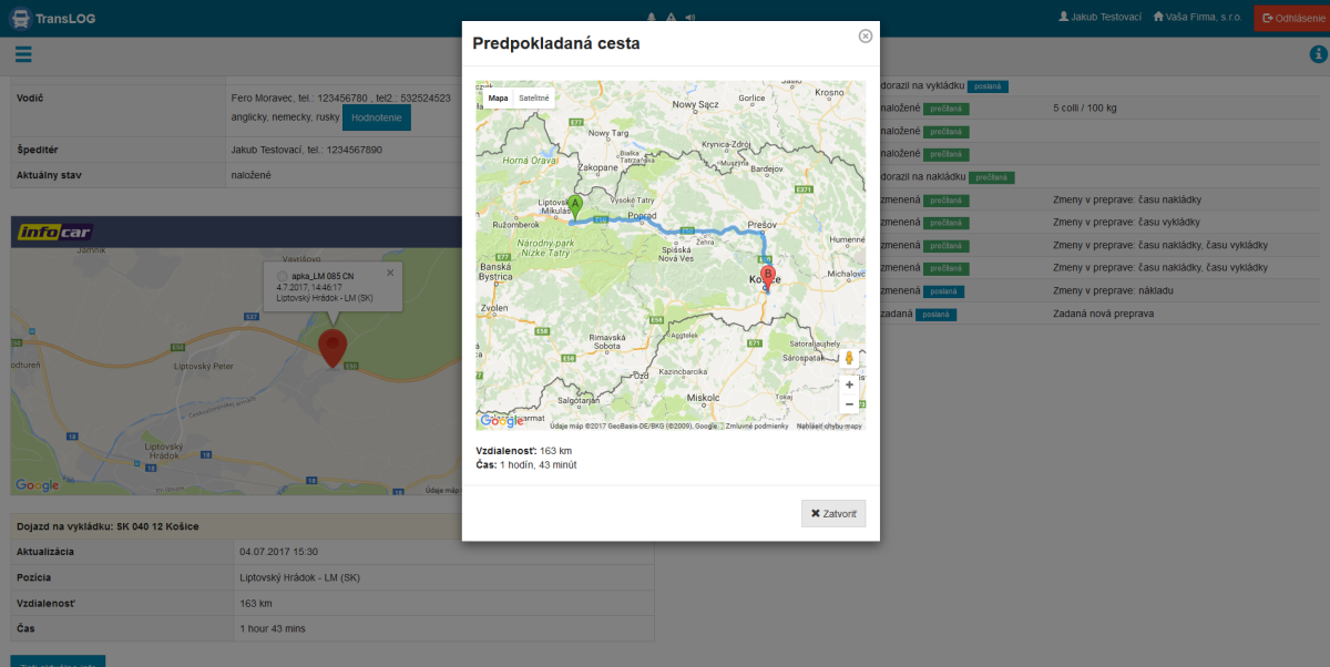 - výpočet vzdialenosti a predpokladaného času dojazdu na nakládku alebo vykládku s možnosťou zobrazenia mapy