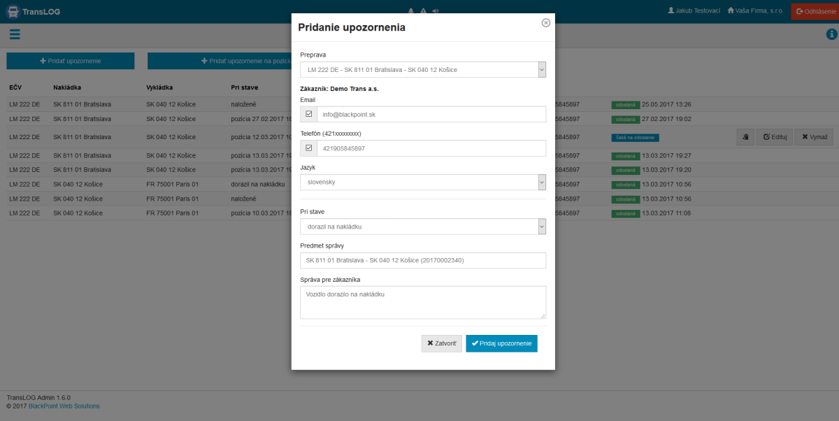 - možnosť automaticky zasielať emailové a SMS-kové upozornenia zákazníkom pri príchode na nakládku/vykládku, po naložení/vyložení nákladu alebo upozornenia na pozíciu nákladu v určené časy v slovenskom alebo anglickom jazyku