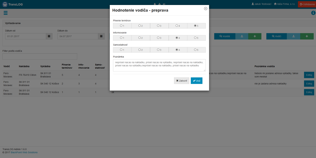 - možnosť zadávať hodnotenia vodičov pre jednotlivvé prepravy, pri ukončených cestách, odovzdaných vozidlách, mesačné hodotenia vodičov s možnosťou stiahnutia hodnotení ako PDF súbor